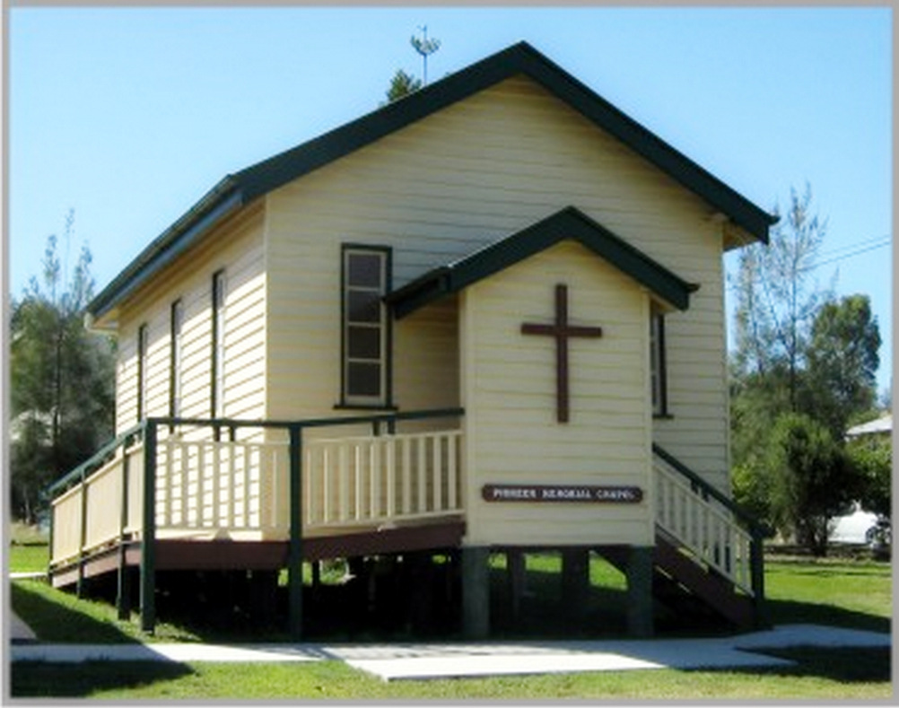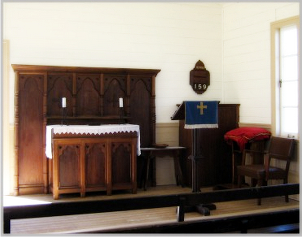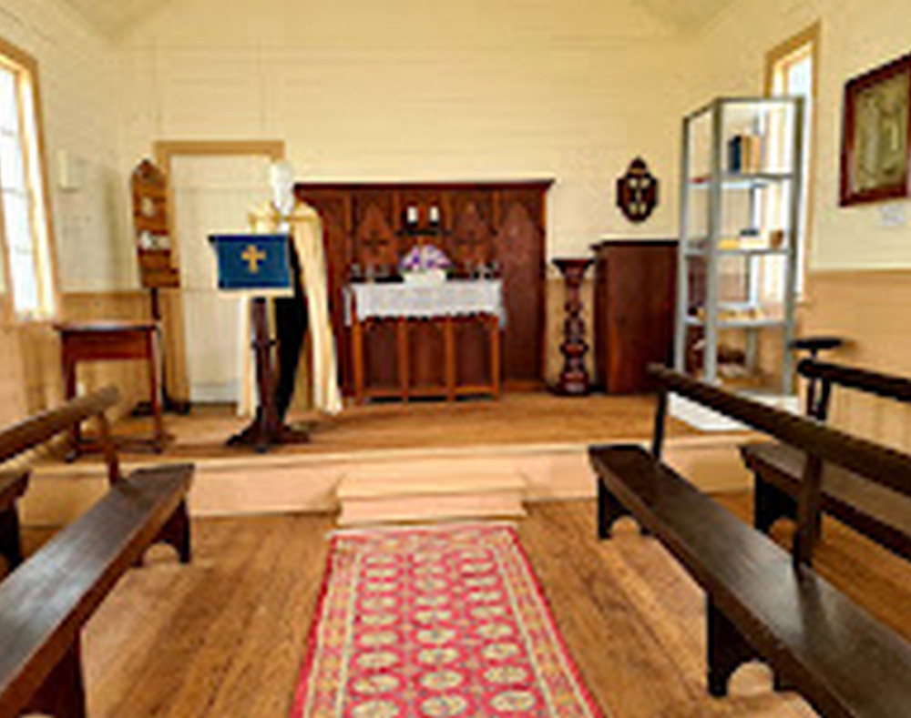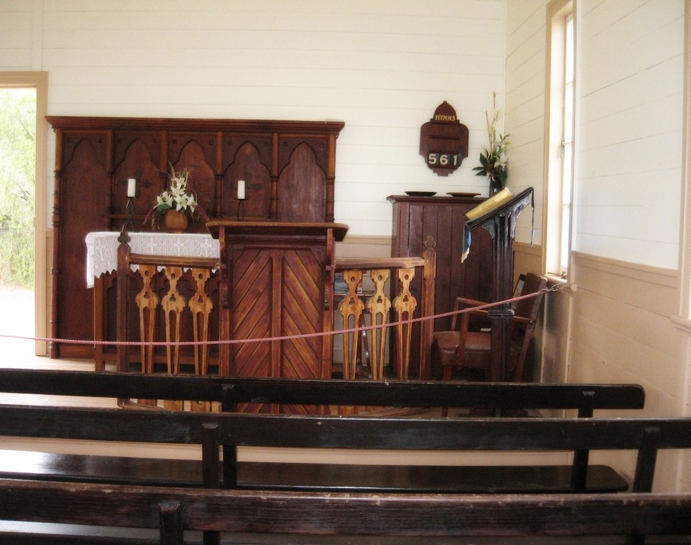 The pews were purchased from the Mt. Sylvia Catholic Church with a donation received from the estate of Margaret Hennley who was Secretary of Historical Society in its foundation. Other furniture was from St George's Anglican Church at Thornton.