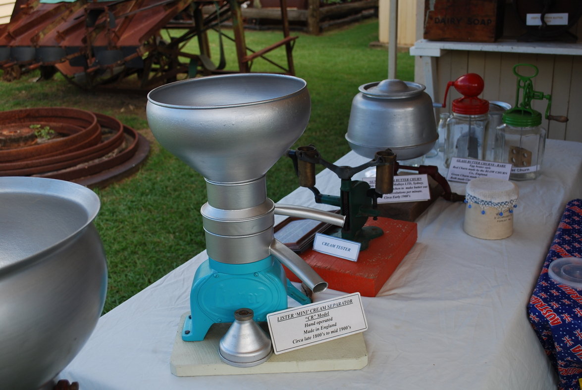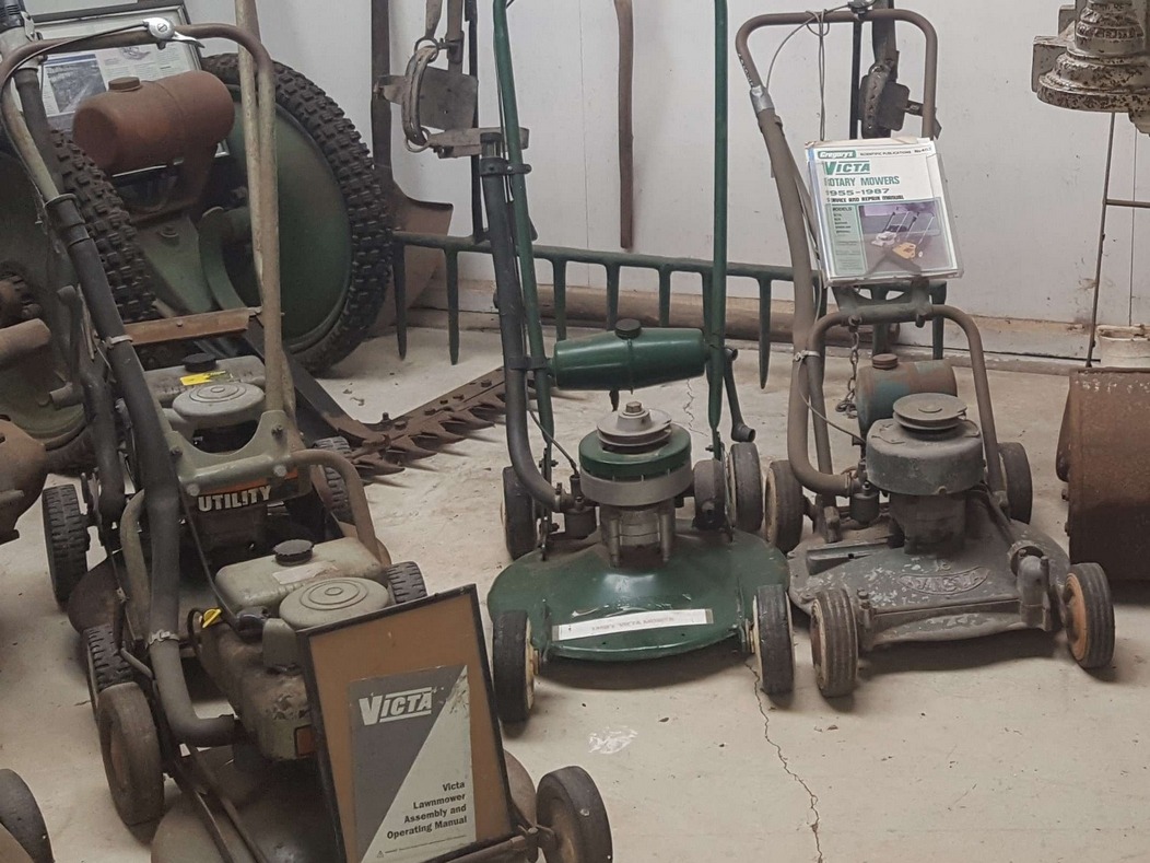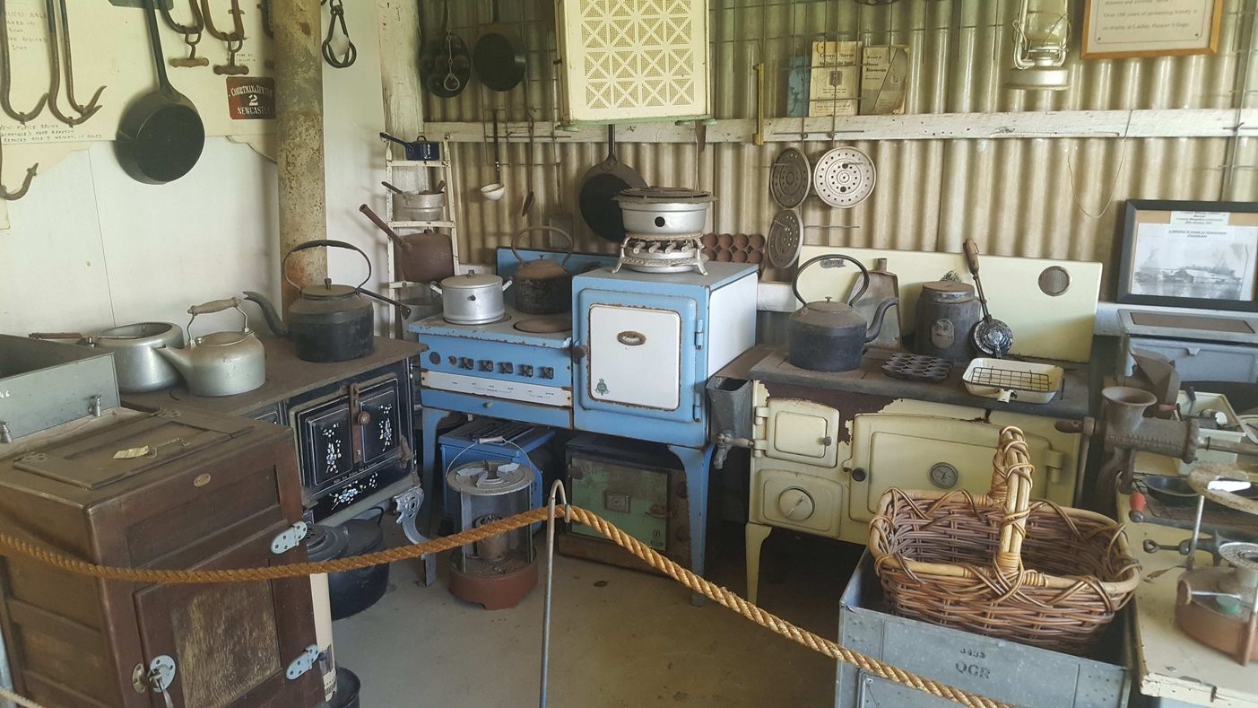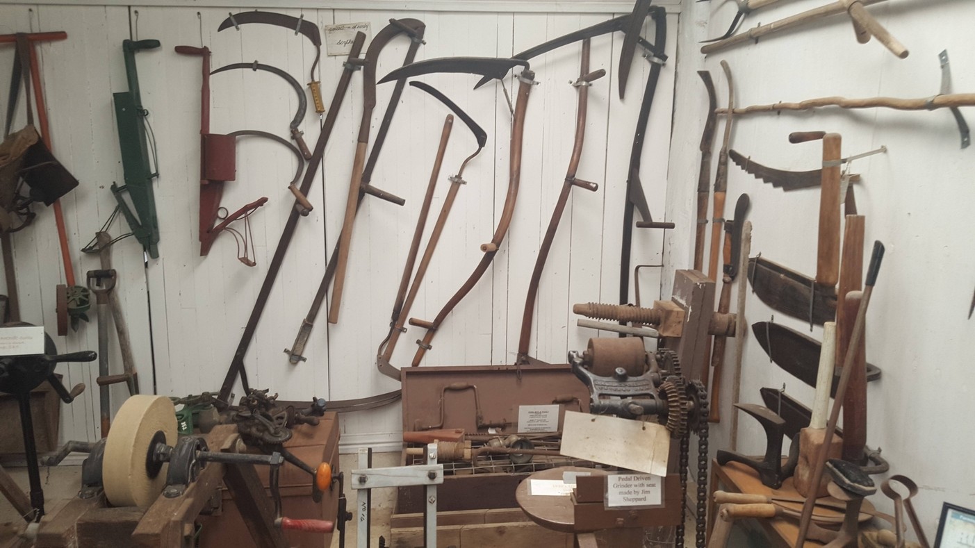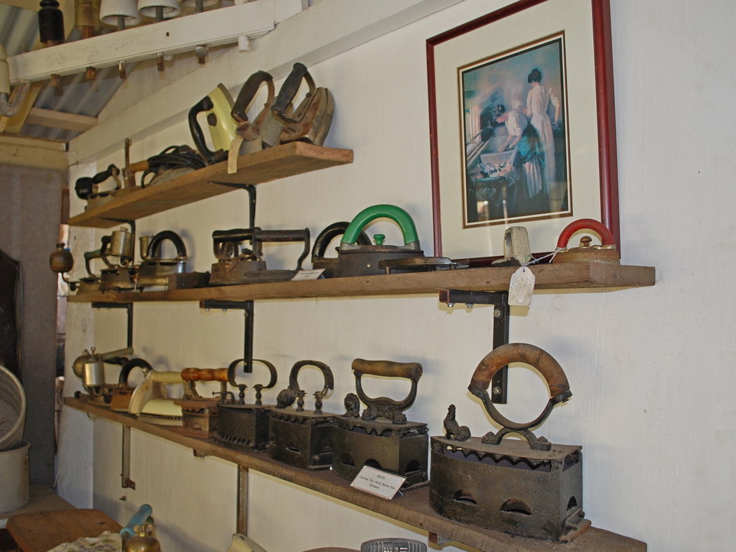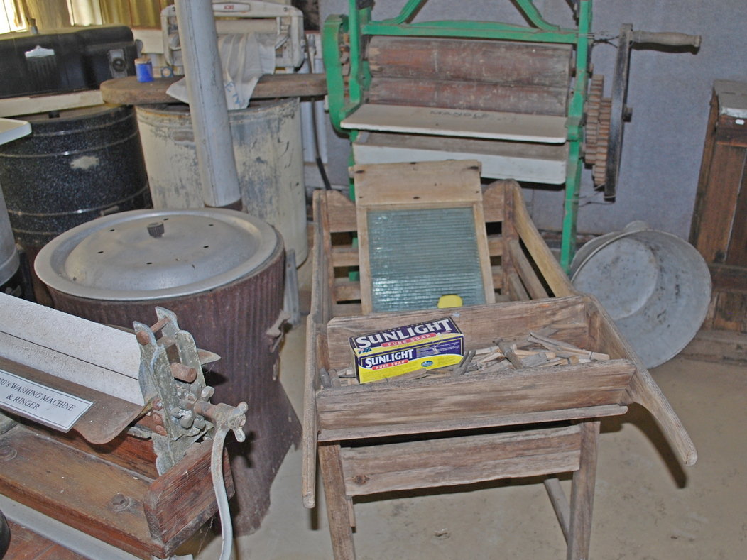 The old dairy houses a comprehensive collection of items relating to the rural lifestyle including old stoves and kitchenware and a laundry area with hand operated equipment used by past generations. There is also a carpenters tool box, a collection of old lawn mowers and, showing the ingenuity of our pioneers, a home made foot operated tool sharpening machine.